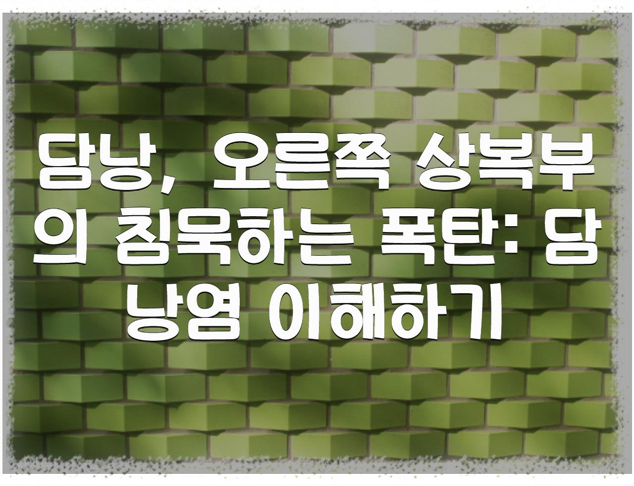 혹시 여러분도 오른쪽 상복부에 갑작스러운 통증을 느낀 적이 있으신가요? 이는 담낭염의 징후일 수 있습니다. 조금만 주의하면 예방할 수 있는 질환이므로, 건강한 생활 습관을 유지하고 담낭염에 대한 정보를 기억하시길 바랍니다.