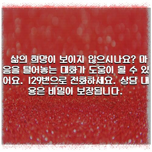 삶의 희망이 보이지 않으시나요? 마음을 털어놓는 대화가 도움이 될 수 있어요. 129번으로 전화하세요. 상담 내용은 비밀이 보장됩니다. 관련내용 확인 해 보시겠습니다.